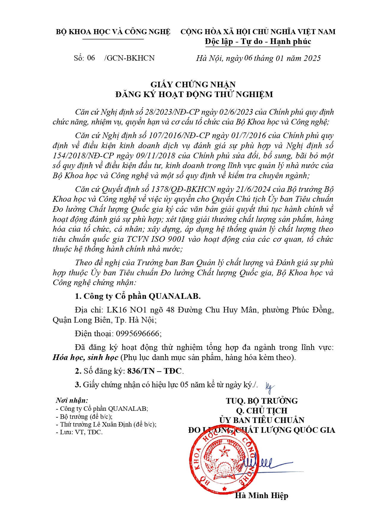 Công ty Cổ phần QUANALAB được thành lập tháng 10 năm 2024 với mục tiêu trở thành đơn vị hàng đầu hoạt động trong lĩnh vực kiểm nghiệm, thử nghiệm, khảo nghiệm và xét nghiệm sản phẩm tại Việt Nam. Với phương châm "Chất lượng là nền tảng – Sự an toàn là mục tiêu", chúng tôi luôn cam kết mang đến những giải pháp toàn diện, chính xác, khách quan và trung thực giúp đảm bảo an toàn cho sức khỏe của cộng đồng và nâng cao chất lượng sản phẩm, duy trì uy tín thương hiệu của doanh nghiệp.